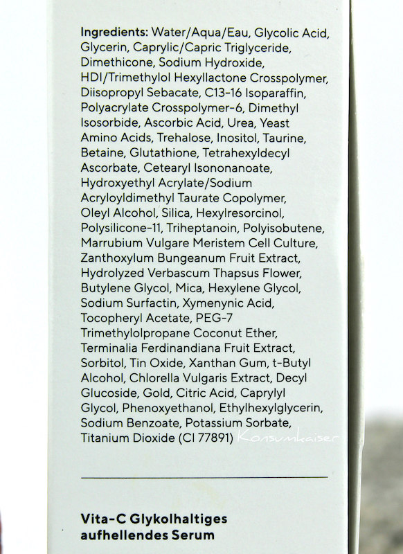 Es finden sich viele gute Feuchtigkeitsspender, hervorragende Antioxidantien, und zur Unterstützung des Aufhelleffektes für die Pigmentstörungen noch Hexylresorcinol, ein Tyrosinasehemmer. Er reduziert die Melaninsynthese und minimiert Hyperpigmentierungen. Über Vitamin C und die Glykolsäure habe ich oben bereits spekuliert. Dazu kommen aber auch noch eine Menge Hilfsstoffe, und dazu ein paar eher selten eingesetzte Pflanzenextrakte mit (für mich persönlich) wahrscheinlich zweifelhaftem Nutzen.