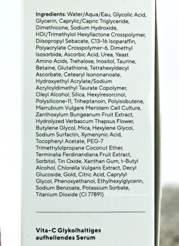 Bleibt noch zu erwähnen, dass das Produkt frei von Duftstoffen und ätherischen Ölen ist, trotzdem kann man ganz leicht einen ziemlich angenehmen Eigenduft wahrnehmen, der aber weder stört noch reizt. Das Vitamin C, und die Glykolsäure „brutzeln“ bei mir nicht auf der Haut, das finde ich höchst angenehm.