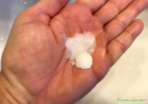 Man kennt auch ähnliche Produkte, bei denen sich die Peelingkörper bei Gebrauch langsam auflösen. Das ist hier NICHT der Fall. Also nicht schrubben, bis die Kügelchen weg sind, sonst steht ihr womöglich morgen noch vorm Waschtisch. 😉