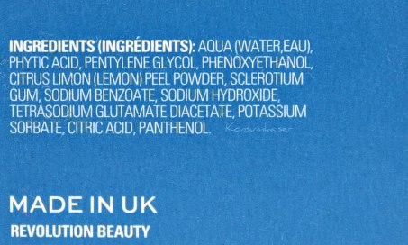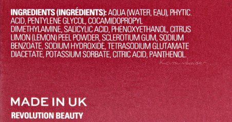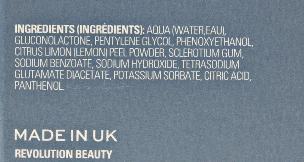 Revolution arbeitet in diesem Produkt alleinig mit der relativ unbekannten Phytinsäure. Eine Alpha Hydroxysäure, die oftmals auch nur als Hilfsstoff in Pflegeprodukten eingesetzt wird. In der hier enthaltenen Konzentration von 10% soll sie exfolieren, einen starken antioxidativen Effekt haben, und dazu etwas hautaufhellend wirken.