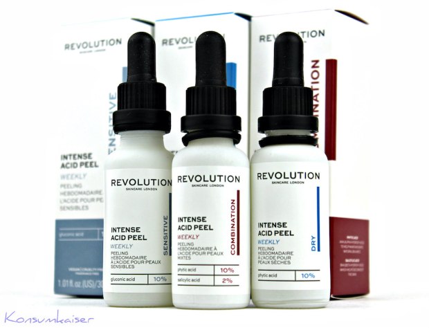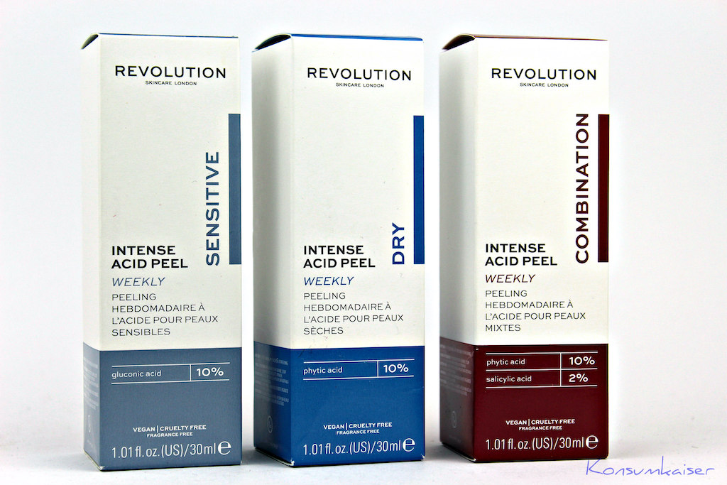 Die Gemeinsamkeit bei den heute gezeigten Produkten: Es geht um Säurepeelings, und die sind in den „Intense Acid Peel Weekly“ Produkten doch einigermaßen hoch dosiert, wie man am Namen bereits erkennen kann.