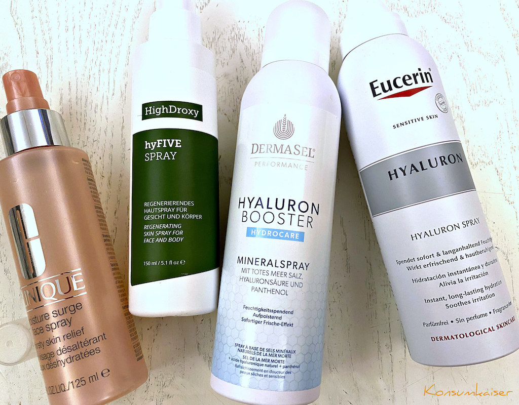 Ich selbst nutze sehr gerne Wassersprays mit Zusatznutzen, also mit spannenden Wirkstoffen, wie man sie auch zB. aus Seren und Konzentraten kennt. Da wäre zB. Hyaluron zu nennen, oder Niacinamid. Unten auf dem Bild ist meine derzeitige Sammlung zu sehen, ich wechsle aber hier wirklich total gerne. (Angaben zur Transparenz: Das HighDroxy hyFIVE Spray wurde mir als Pressemuster unverbindlich zur Verfügung gestellt. Das Dermasel Hyaluron Booster Spray wurde mir von einer freundlichen Leserin zugeschickt. Die Sprays von Eucerin und Clinique wurden selbst gekauft.)