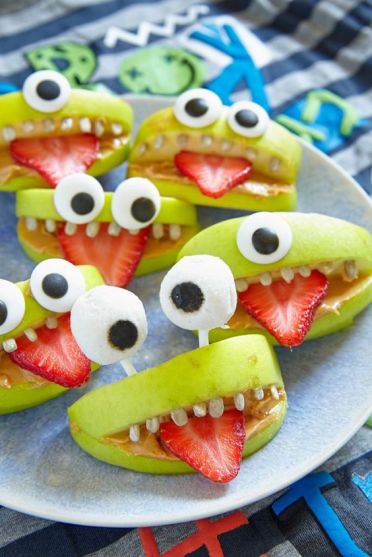 Es geht aber aber auch gesünder. Mit Apfel, Erdbeere, den Augen und ein paar Reiskörnern.