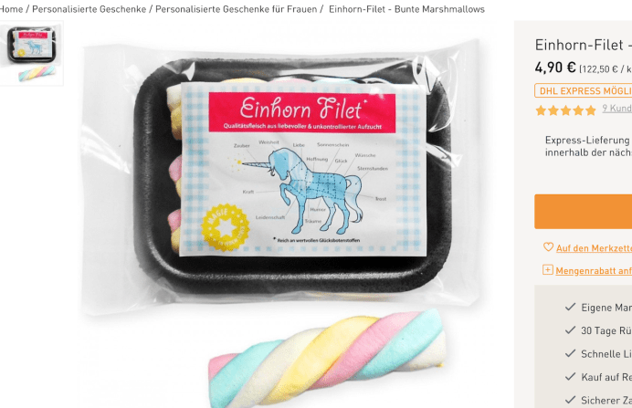 Und wer seinen vorlauten Kinder mal ein wenig Realismus und Wertschätzung für Lebensmittel beibringen möchte, kann sie doch mit leckerem Einhorn-Filet erschrecken? Böse, böse.