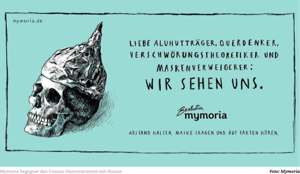 Ich habe mir einen Mund-Nasen-Schutz mit der Aufschrift: „Corona schafft Arbeitsplätze – Ihr Bestattungsinstitut“ bestellt. Uns Wienern wird ja eine gewisse Affinität für’s Morbide nachgesagt :-).