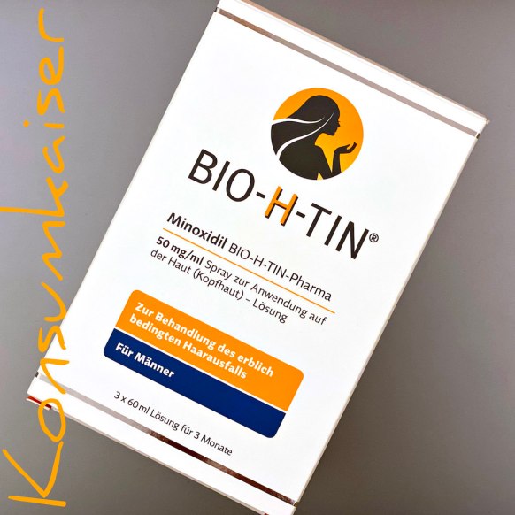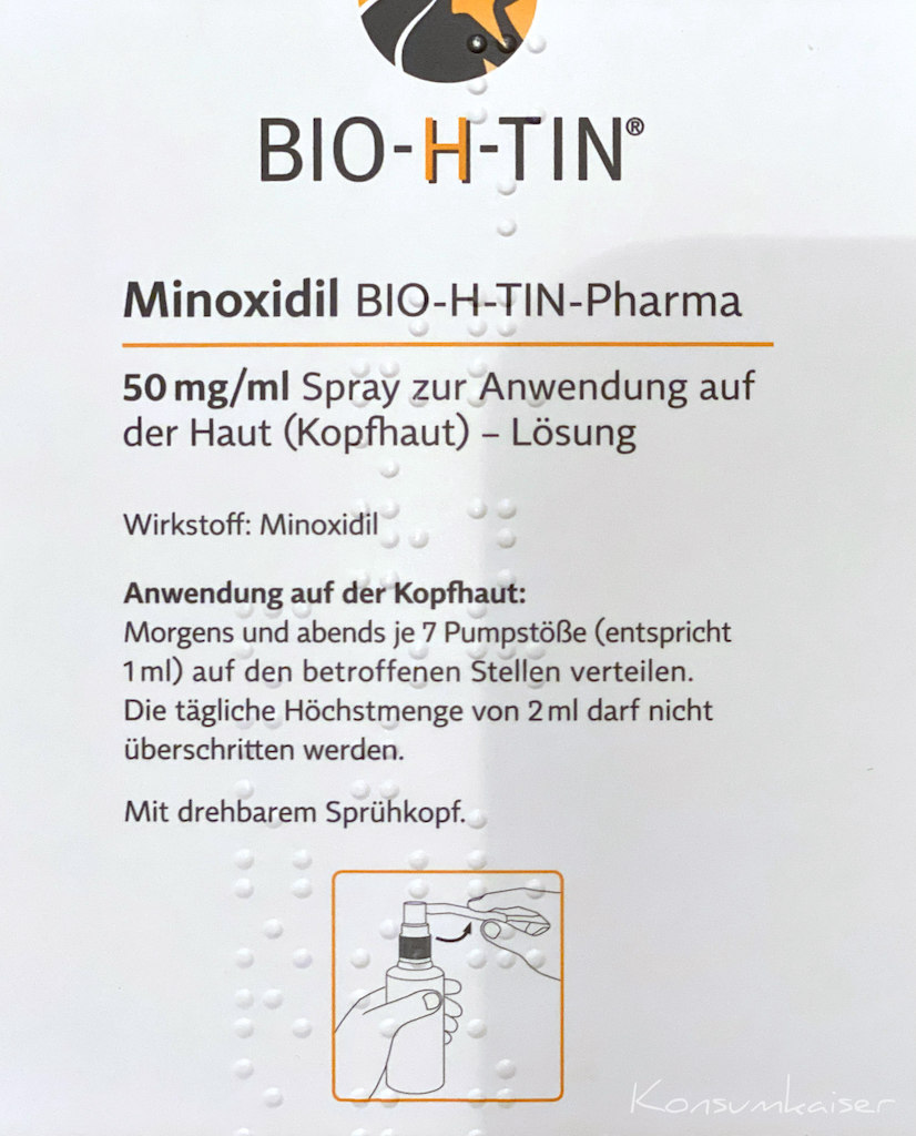 Ich habe mich für eins der zahlreichen Präparate für Männer mit 50 mg Minoxidil von Bio-H-Tin entschieden, dabei war einzig der günstige Preis für mich entscheidend (eine 3-Monatspackung kostet ab ca. 30 Euro). Das entsprechende Produkt für Frauen ist deutlich niedriger dosiert (20 mg Minoxidil), kostet aber meist nur unwesentlich weniger als das Männerprodukt.