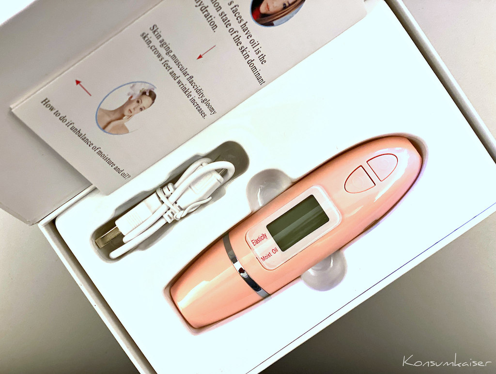Wer also nähere Informationen zum Hautzustand, der Feuchtigkeitsversorgung und dem Fettgehalt haben möchte, kann es ja einmal mit diesem Gerät in Rosé versuchen. Es soll auch eine Aussage zur Hautelastizität machen können, was ich aber ein wenig bezweifle.