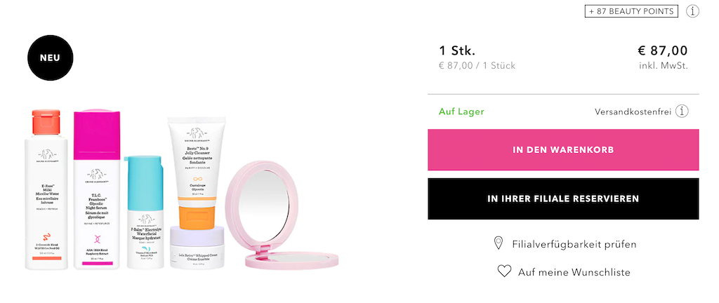 Das C-Firma Day Serum, die Protini Polypetide Cream und das T.L.C. Framboos Glycolic Night Serum bekommt man beim grünen Platzhirsch derzeit zum üblichen Preis in einem üppig ausgestatteten Set. Das Originalprodukt wird von mehreren Luxussamples begleitet, und es gibt noch ein paar Gimmicks (Handspiegel, Buchhülle…).