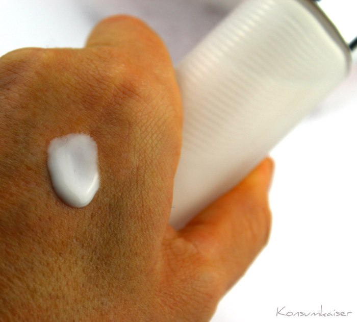 Ja, was da aus dem Spender kommt ist in der Tat eine recht nüchtern aussehende Sache. Eine ziemlich dünnflüssige Emulsion, die zart und hochwertig duftet, sich aber schnell und elegant auf der Gesichtshaut verteilen lässt.