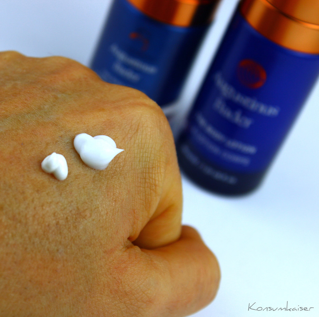 Aber nein, ich zügle mich und nutze die stecknadelgroße Menge für die Augenpartie, meine knittrige und pigmentgestörte Stirn, die Nasolabialfalten, sowie die letzen Reste für den vordern Hals. Erstaunlich: Selbst die kleine Menge reicht aus, um die Haut zufriedenzustellen. Keine Spannung, kein Schrei nach „meehr“, Feuchtigkeit perfekt, Fett perfekt, kein Glanz, aber dafür satte, „leuchtende“ Haut. Selten so gestaunt – zumindest als Momentaufnahme.