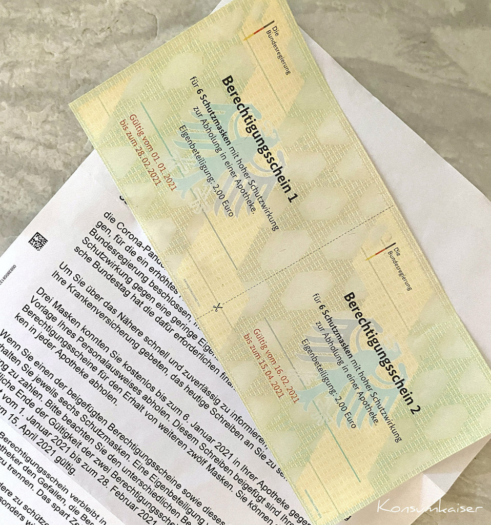 Als gäbe es keine anderen Probleme, hat die Bundesregierung doch tatsächlich zur Verteilung der FFP2 Masken an die Risikogruppen, die Bundesdruckerei beauftragt offizielle und fälschungssichere(!) Berechtigungsscheine zu drucken, die zuerst an die zuständigen Krankenkassen/Krankenversicherungen und dann an die Versicherten verschickt wurden. Bei meiner über 80-jährigen Mutter kamen sie gerade an.
