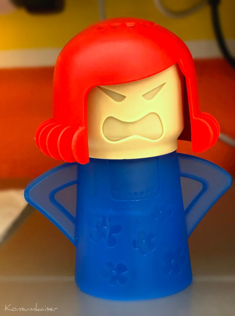 Aber Schwiegermüterchen kriegt derweil den Kopf abgenommen (yeah!), dann kommt Wasser und ein Spritzer Zitrone rein, und ab mit ihr in das tobende Mikrowellengerät. Die Flüssigkeit verdampft, lässt sich auf den meist mit störrischer Tomatensoße befleckten Wänden nieder, und nach Beendigung der Wellenbehandlung, braucht man den von innen dampfenden Magnetofen nur noch mit einem trockenen Tuch sauber wischen.
