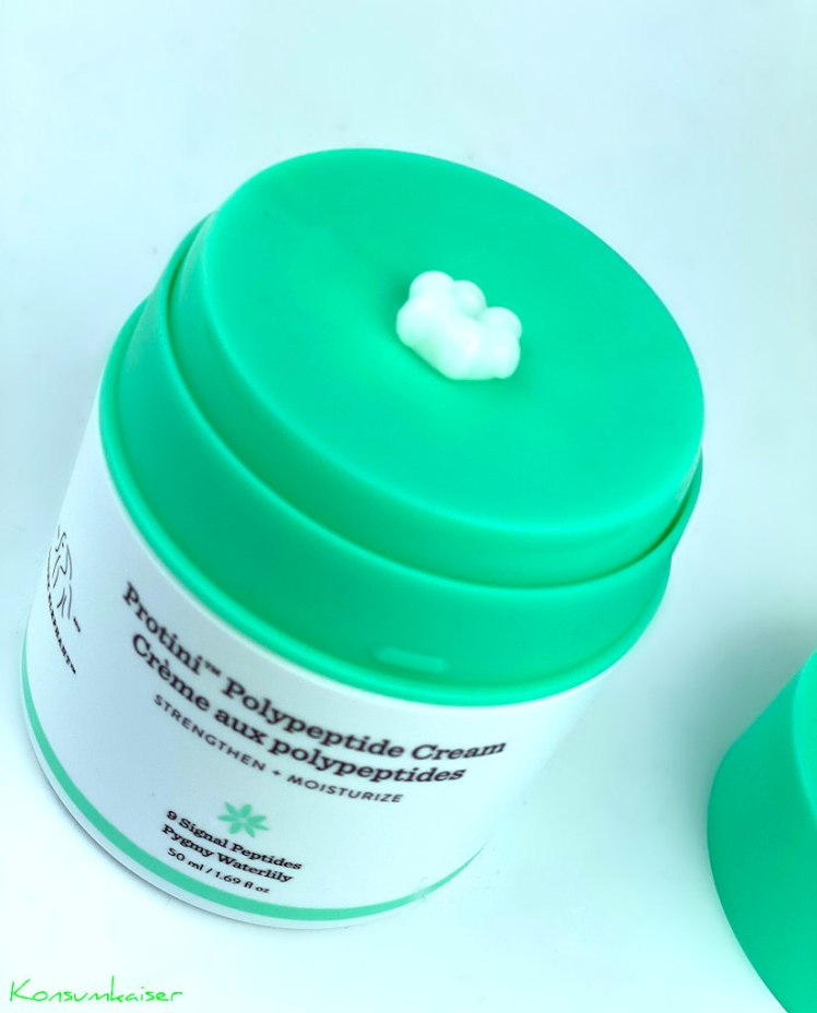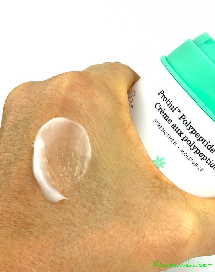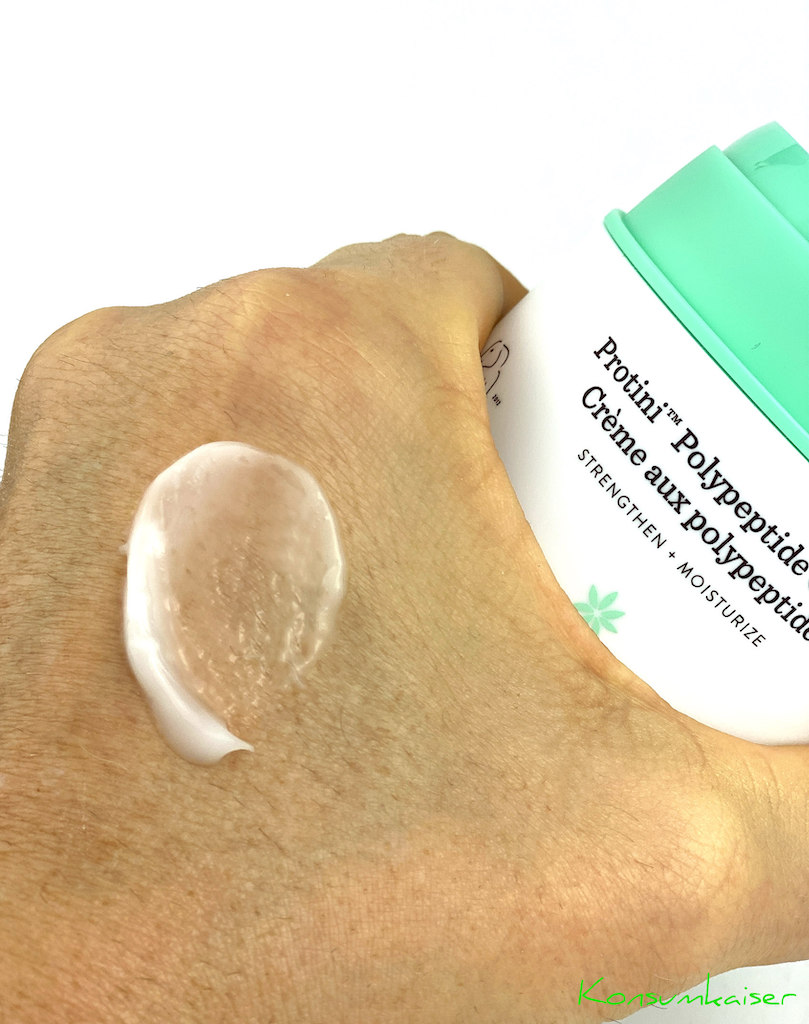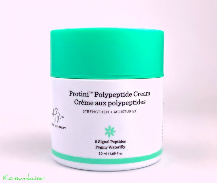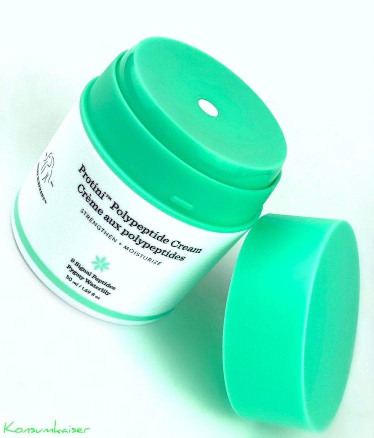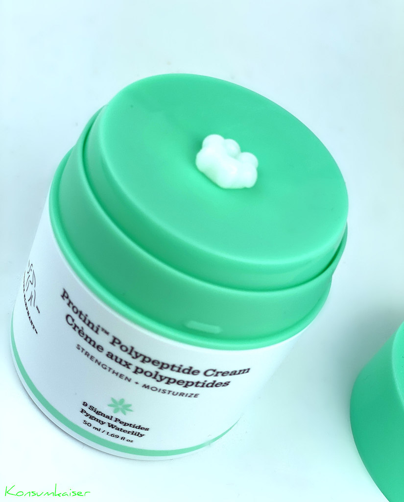 Die Creme mit Polypeptiden (eine Menge „Eiweißketten“), Drunk Elephant nennt sie „Proteini Polypeptide Cream“, ist aber eigentlich keine Creme im eigentlichen Sinne, sondern meiner Meinung nach eher ein festeres Gel, oder ein Creme-Gel. Ich würde sie mit dem Moisture Surge 72-Hours Hydrator von Clinique vergleichen.