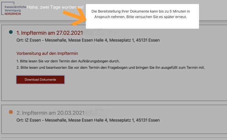 Die Termine wurden am späten Abend endlich gebucht. Die dazu notwendigen Dokumente waren allerdings nicht downloadbar. Ein Witz der Hinweis auf die Dauer von angeblich fünf Minuten Wartezeit. Nach zwei Tagen konnten Aufklärungs- und Anamnesebogen endlich heruntergeladen werden.