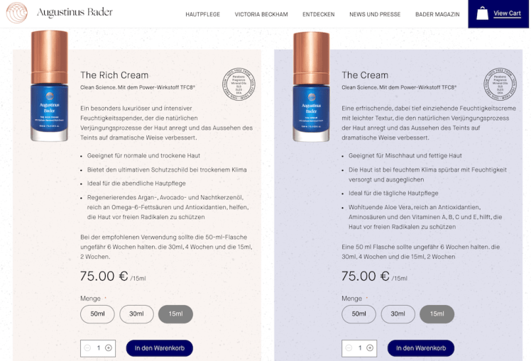 Allerdings ganz anders als ich dachte: Kosten zum Beispiel die Einsteigergrößen (15ml) von den Flagship-Produkten The Cream und The Rich Cream im Bader-Onlineshop genau den identischen Preis, so kommt man in so manchen Läden (zB. bei Flaconi, die ja auch mit ominösen Minutenpreisen „glänzen“) deutlich schlechter weg.