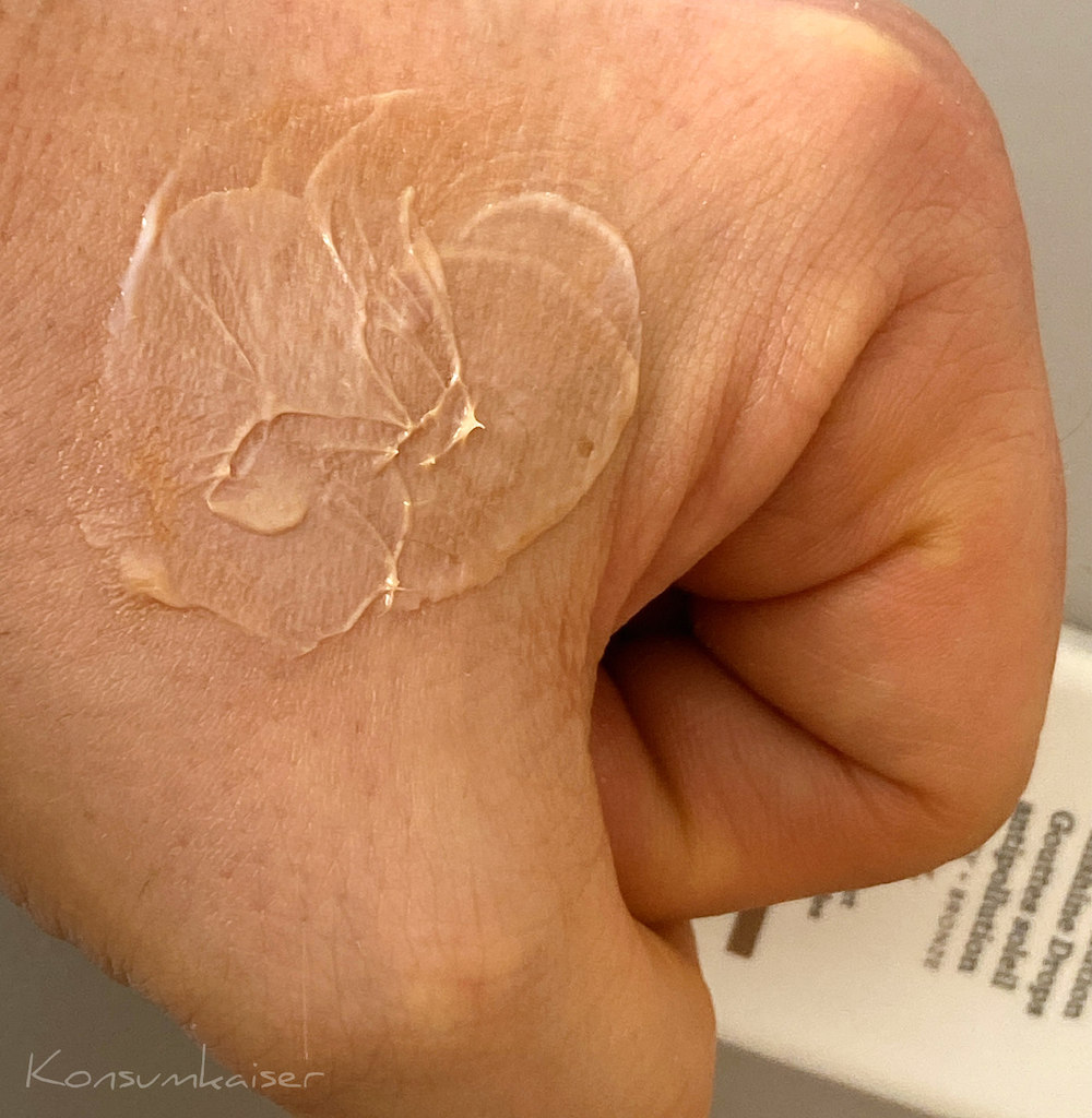 Daher habe ich ihn mir mal gekauft, es gab auch gleich die neue Flasche mit Schüttschnabel, die nun ohne Plastikpumpspender auskommt, was ich bei der kleinen Tube (und bei der Menge Plastik) gut verschmerzen kann. 30ml sind schnell aufgebraucht, der Inhalt ist da auch so gut genug geschützt.
