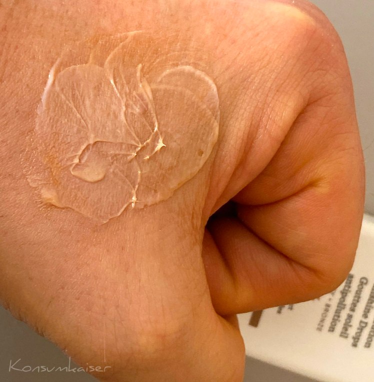 Die Tropfen sind nicht wasserfest, haben keinen nachhaltigen Selbstbräunungseffekt, und sie können schnell und einfach mit Wasser abgewaschen werden. Auch empfindliche Haut kann einen Versuch starten, meine Rosacea hat hier alles prima vertragen.
