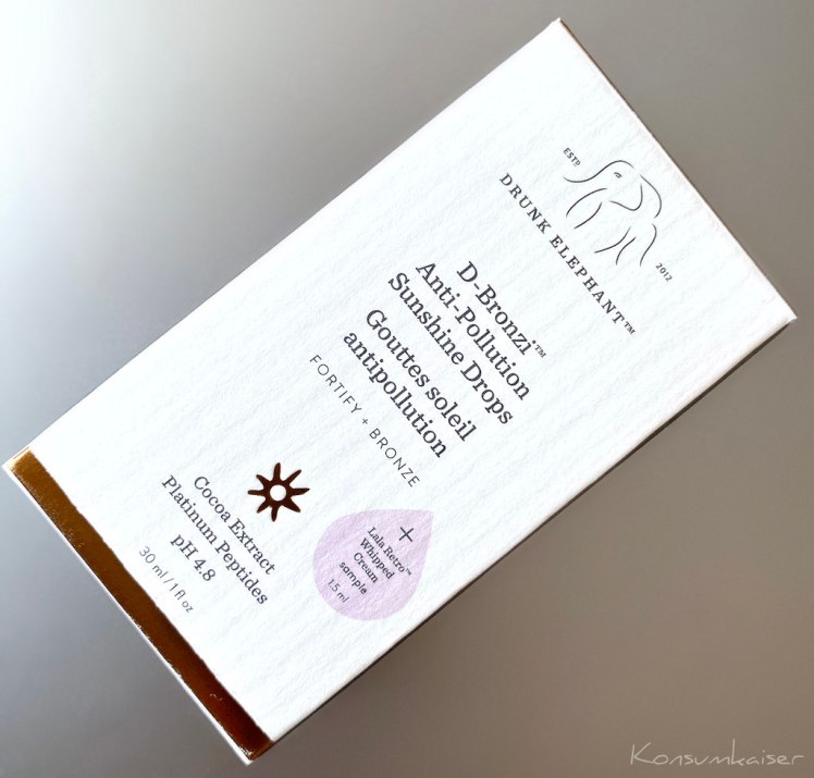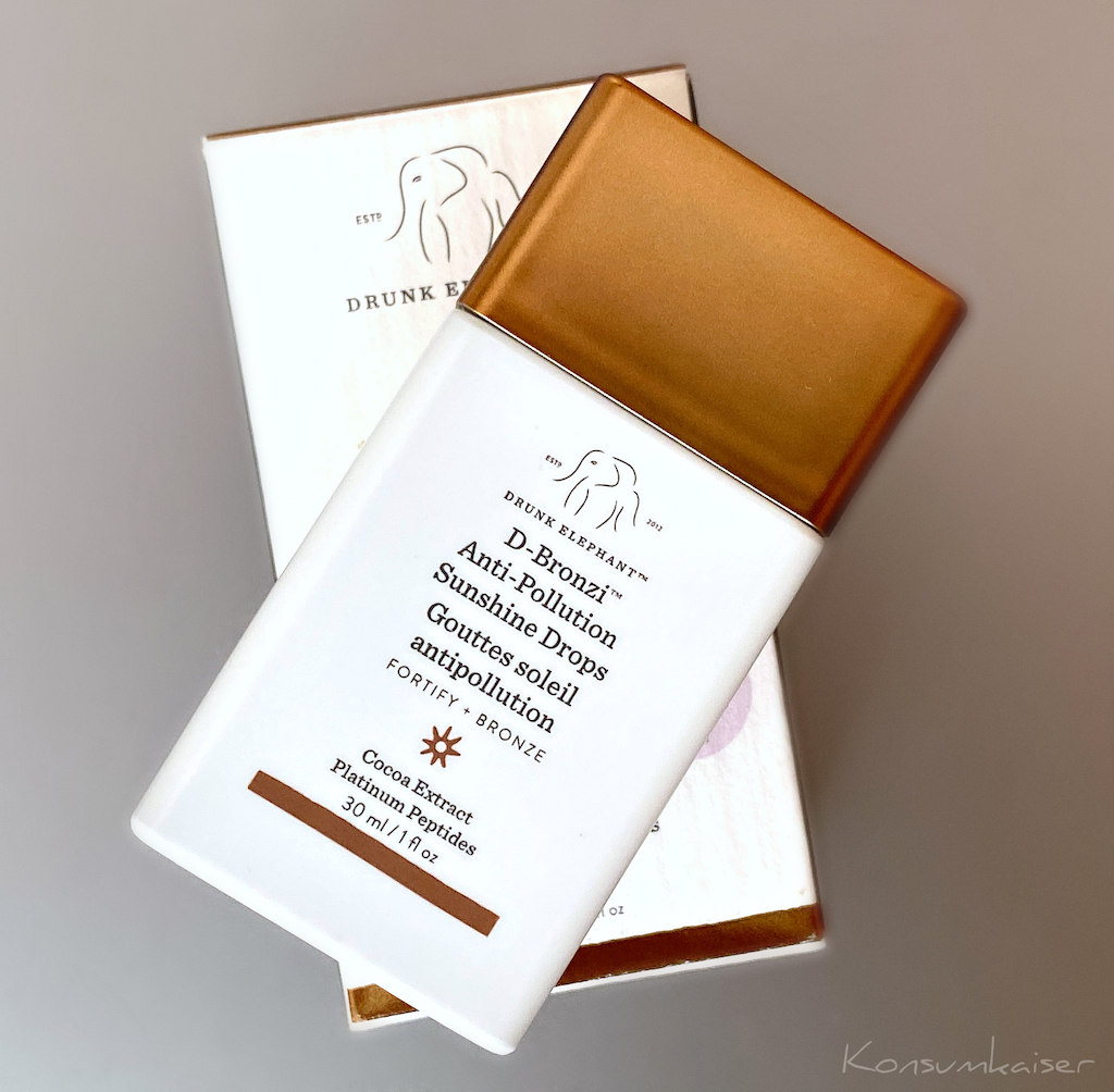 Heute nochmals ein Produkt von US-Kultmarke und Liebling aller Verpackungsopfer Drunk Elephant. Es handelt sich um die Bronzer-Tropfen „D-Bronzi Anti-Pollution Sunshine Drops“, und da sagt der Name eigentlich schon so gut wie alles. Interessante Inhaltsstoffe und lebendige Farbe fürs Gesicht, inklusive guter Laune – ob sich das lohnt?