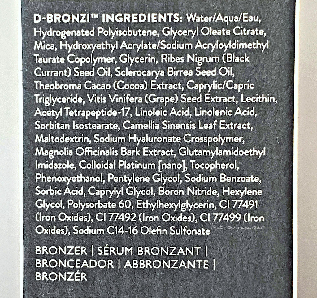 D-Bronzi selbst würde ich aber immer mit einer mustergültig verteilbaren Grundlage mischen, da das Produkt selbst nicht unbedingt über die Haut flutscht (es trocknet sehr schnell). Dafür sind aber auch weder unguter Alkohol noch Silikone enthalten, die sonst meist für elegante Texturen sorgen können.
