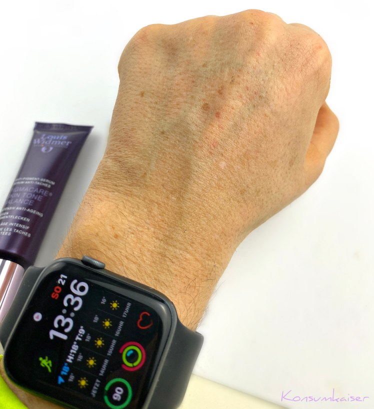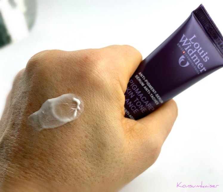Pigmacare wird als Serum bezeichnet, ist aber von der Konsistenz in meinen Augen eine Milch. Es fühlt sich leicht und feucht an, und die kleine Menge, die man braucht, ist im Handumdrehen in der Haut verschwunden. Es gibt kein klebriges Gefühl, dafür aber ein schön weiches Hautgefühl. Dank Silikonen lässt sich das Produkt also toll verteilen, sinkt trotzdem gut ein, es bleibt kein silikoniges „Stehen“ auf der Haut.