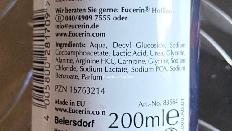 Eucerin gibt den Gehalt an Urea nicht direkt an, ich schätze ihn aber hier auch auf ca. 5%, da vergleichbare Produkte ähnliche INCI-Listen aufweisen.