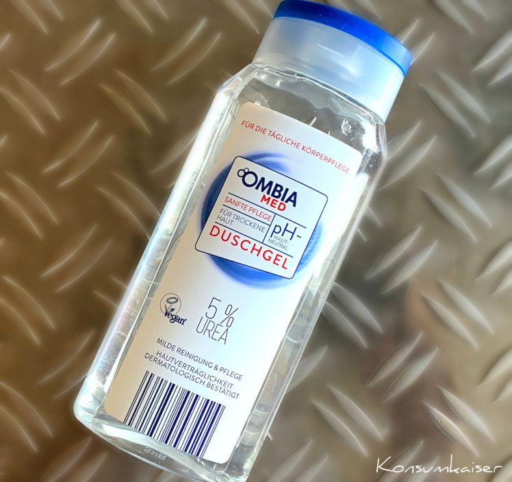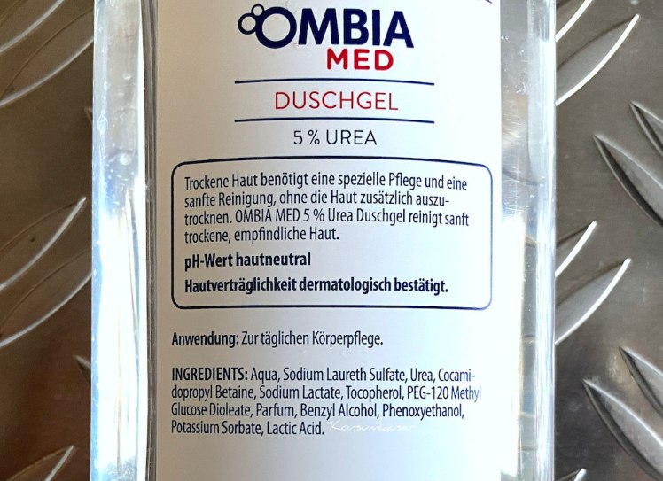 Das Duschgel von Ombia (die Aldi-Eigenmarke, bitte keine Verwechslungen mit Personen), kommt hier in der „Med“ Version und enthält 5% Urea, den Feuchtigkeitsspender und Speicher. Da es eine Menge Waschprodukte mit Urea auf dem Markt gibt, gehe ich davon aus, dass die rückfettende Wirkung tatsächlich funktioniert, und nicht alles wieder abgewaschen wird.