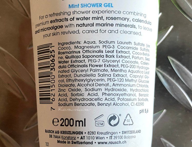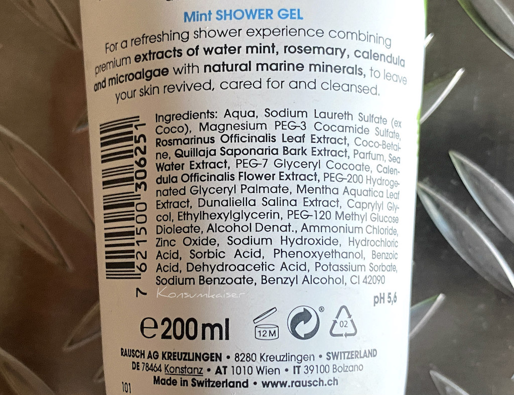 Ich finde die Inhaltsstoffliste für ein Duschgel erstaunlich lang und irgendwie unüblich, aber es funktioniert bei mir sehr gut. Haar und Haut sind sauber, nichts wirkt ausgetrocknet, und dazu kommt die äusserst belebende Wirkung der Minze. Für meinen Geschmack eine Wohltat.