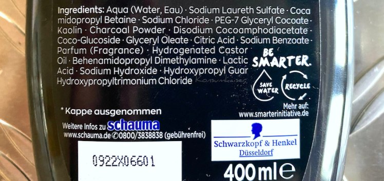 Schauma ist very Basic, ich weiß. Aber irgendwie auch praktisch und gut. Die Menge in der üppigen Pulle ist unschlagbar, und das Zeugs macht unkompliziert sauber – radikal. Das brauche ich manchmal, ohne zu viel rückfettendes Zeugs, einfach nur quietschsauber und nicht zu lange nachduftend.