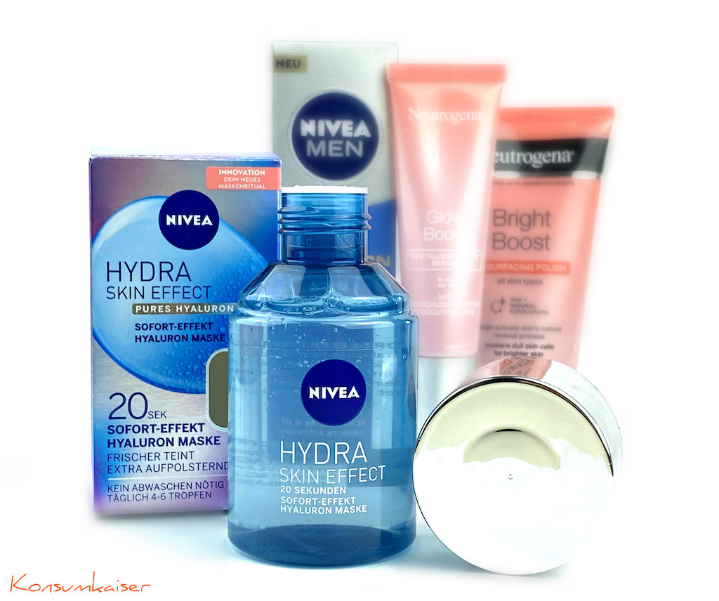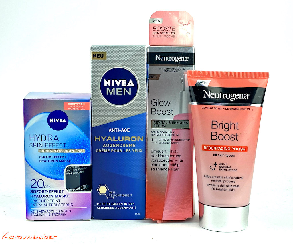Nivea zeigt die Hydra Skin Effect Serie, die sich (natürlich) um Feuchtigkeit für die trockene Haut kümmern soll, ähnlich wie die Anti-Age Hyaluron Serie für Männer aus der Men-Linie. Neutrogena kommt mit Glow Boost, eine Effektserie, die die Haut schöner und strahlender aussehen lassen soll.