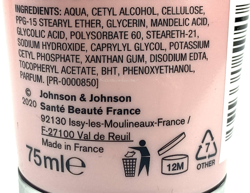 Die mechanischen Peelingkörper sind aus Cellulose, und das chemische Peeling wird durch Mandel- und Glykolsäure realisiert. Nun wird das ja auf die feuchte Haut massiert und sogleich wieder abgewaschen, man braucht also auf keinen starken chemischen Peelingeffekt hoffen, aber der Rest funktioniert prima, und die Säuren bringen ein klein wenig Glow, sowie zusätzliche Feuchtigkeit an die Haut.