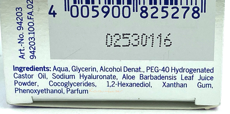 Optische Weichzeichner oder Glitzer finden sich natürlich nicht, Hyaluron-Salz ist auch nicht in Unmengen vorhanden, und ansonsten vermisst man schon so einige typische Inhaltsstoffe, die die Bezeichnung „Anti-Age“ auf dem Nivea Men Karton rechtfertigen könnten.