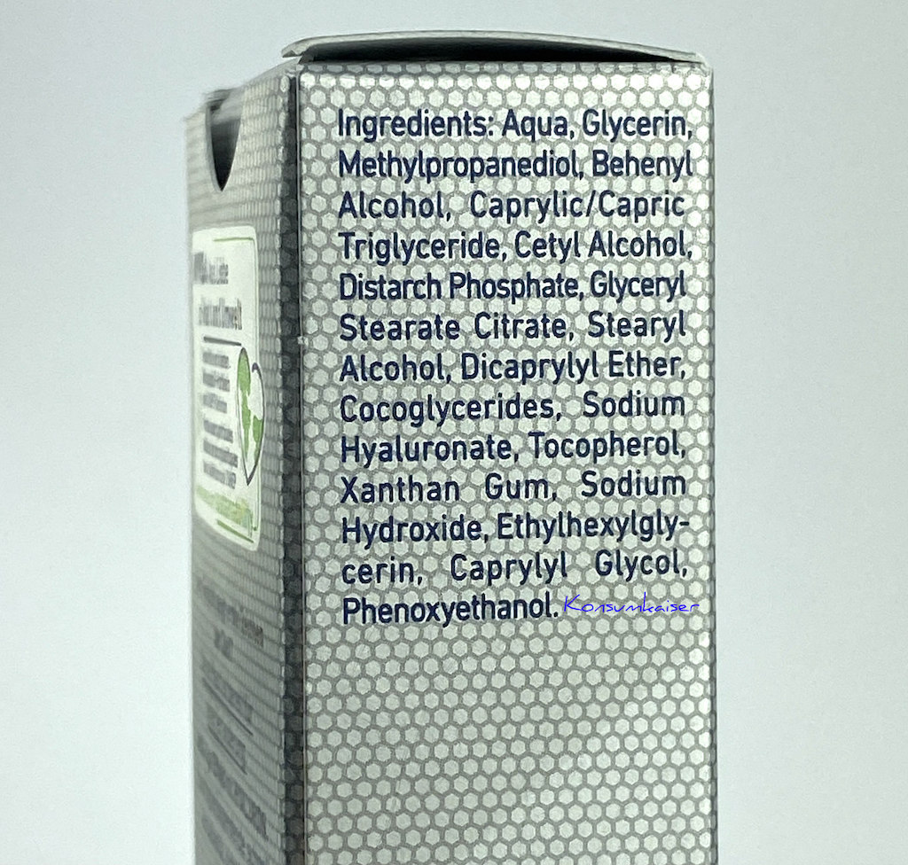 Feuchtigkeitsspender sind u.a. Glycerin, Hyaluron-Salz und Aloe-Pulver, was ok ist, aber eben auch nur purer Standard, mehr nicht.
