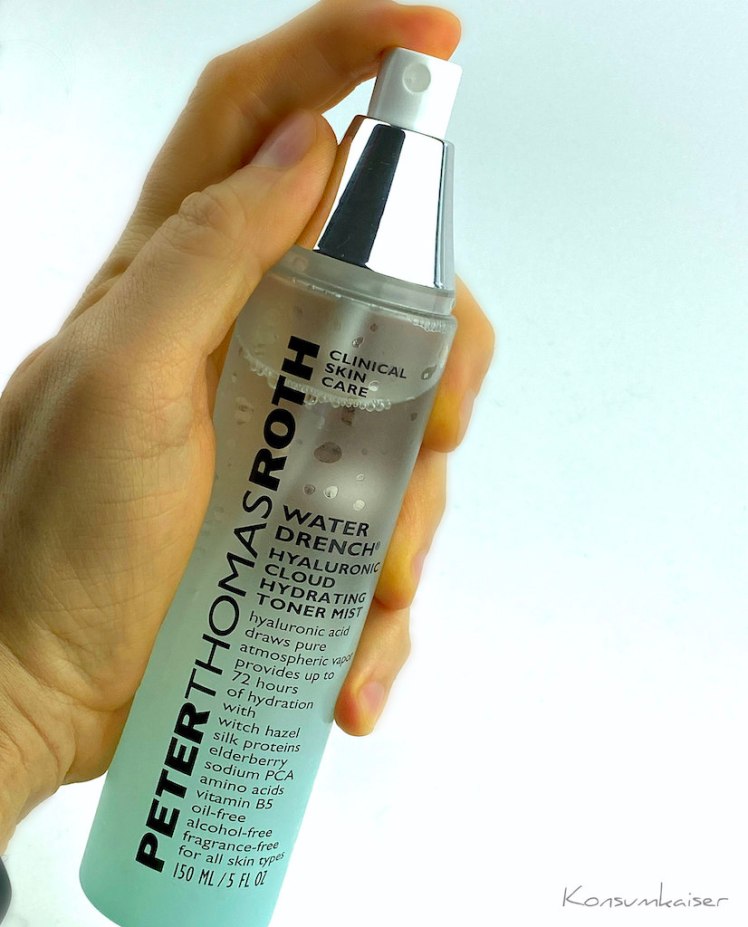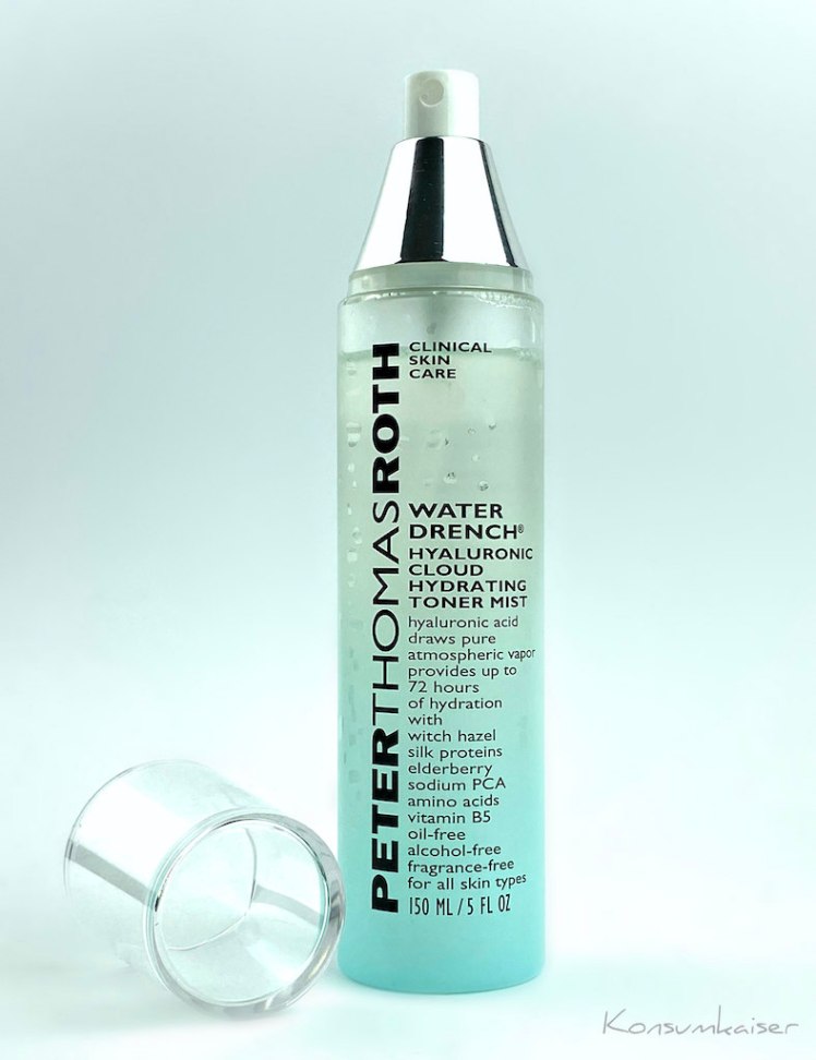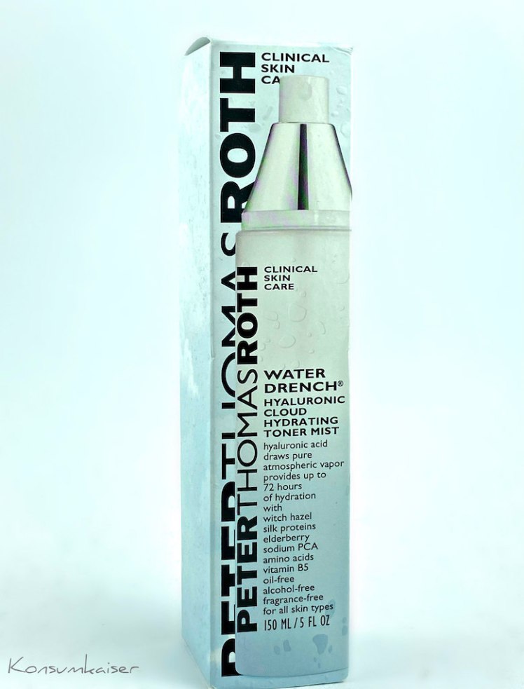 Schön kühl und nass, daran denkt man sogleich, wenn man die Verpackung vom „Water Drench Hyaluronic Cloud Toner Mist“ von Peter Thomas Roth betrachtet (wer denkt sich eigentlich immer diese ellenlangen Produktnamen aus, und wer gibt denen mal nen Klaps auf den Hinterkopf?)