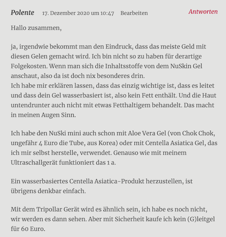 Man kann auch behaupten, dass viele der Apparate tatsächlich etwas können, zumindest sind sie in der Lage ein Hautpflegeprodukt deutlich besser, schneller und m.E. tiefer in die Haut zu schleusen. Somit sind hinterher die optischen Aufpolsterungseffekte meist schon recht erstaunlich.