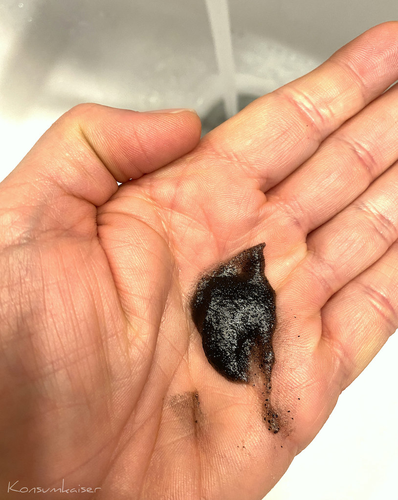 Sehr trockene Haut sollte ebenfalls aufpassen, denn das Peeling saugt durch „Vulkansphären“ (besser bekannt als schnöder Bimsstein) und Aktivkohle ziemlich viel Hautfett auf. Ölige Haut wird das aber sicherlich mögen.