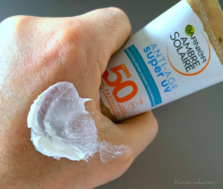 Habe sie im dm schnell mal mitgenommen. Sieht recht gut aus, was die Inhaltsstoffe angeht. Nicht das Modernste, aber momentan suche ich einfach nur eine schön verträgliche, schnell einziehende, parfümfreie, nicht weisselnde, nicht glänzende und nur wenig fettende UV-Schutzcreme für jeden Tag. Tadaa: Die Anti-Age Super UV 50 von Garnier (knapp 10 Euro) macht einen klasse ersten Eindruck!