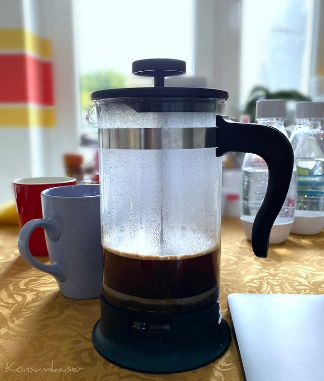 OK, das muss geändert werden, habe ich mir gedacht. Eine Packung mit entkoffeiniertem Kaffe und eine normale Packung „Vollfett-Kaffe“ habe ich nun im Verhältnis 3:1 gemischt und brühe dies nun mit einer schlichten Stempelkanne auf. Diese Methode der Kaffeebereitung ist nun wirklich nicht neu, wird auch „French Press“ genannt, aber bereitet mir und meinen Geschmacksnerven derzeit eine Menge Freude.