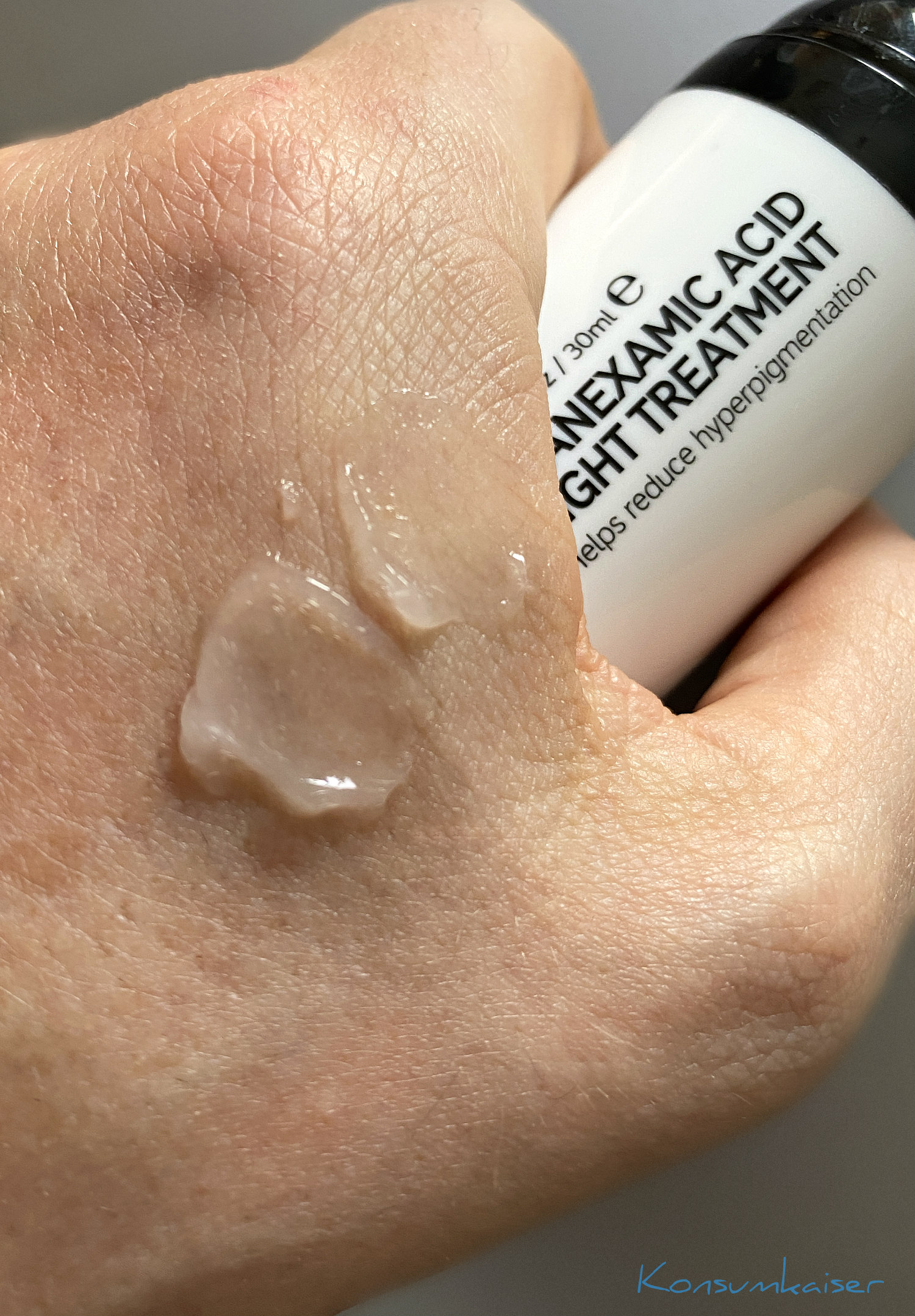 Die Tranexamsäure stammt eigentlich aus der Medizin und ist hilfreich um zB. stärkere Blutungen zu kontrollieren. Da weiß man auch, dass der Wirkstoff ein gewisses Allergiepotenzial besitzt, auch auf der Haut. Daher empfiehlt sich vor der Anwendung ein kleiner „Patchtest“ (zB. an der Innenseite des Unterarms).
