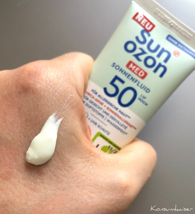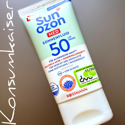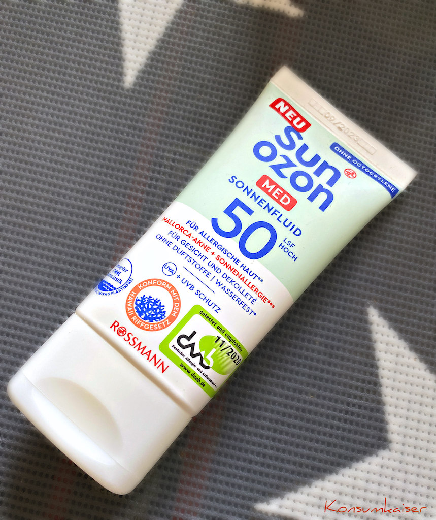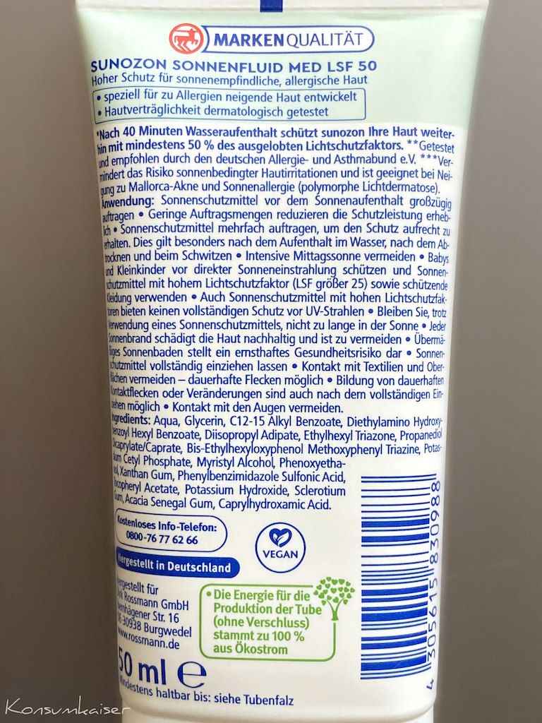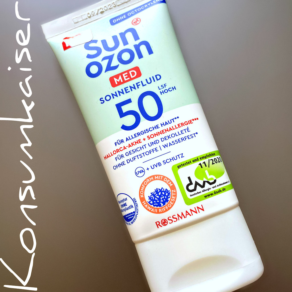 Das Sonnenfluid ist aus der „Med“ Linie der Rossmann-Sonnenschutzmarke, kommt mit einem guten Lichtschutzfaktor 50 und ist als „wasserfest“ deklariert. Mit der „Med-Deklaration“ kommt auch die Empfehlung dieses Produktes für Allergiker und Asthmatiker.