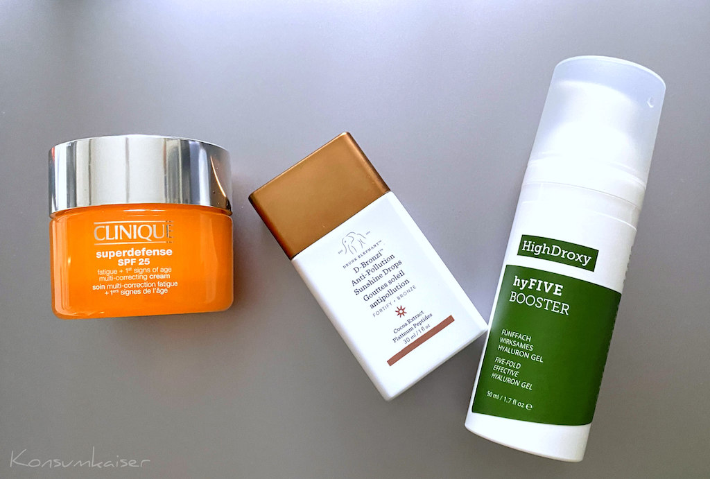 Darüber kommt dann meine derzeitige Lieblings-Tagescreme mit Lichtschutz, die Clinique Superdefense. Die ist mit 25 nicht besonders hoch im Schutz, aber ich halte mich momentan kaum im Freien auf, sodass ich das ok finde. Bin ich öfter draußen, nutze ich die Version mit dem höheren Schutz. Alles von Clinique.