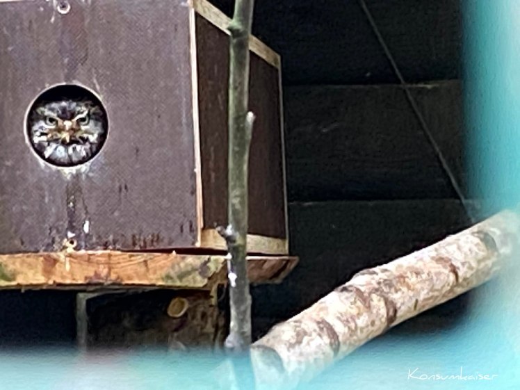 So ein seltenes Schauspiel! Und grimmig schaute die kleine Eule aus der Wäsche, eujeujeu. Ganz vorsichtig habe ich meine Handykamera eingeschaltet und ein paar Fotos geschossen. Schaut selbst, da guckt einer ganz schön grumpy!