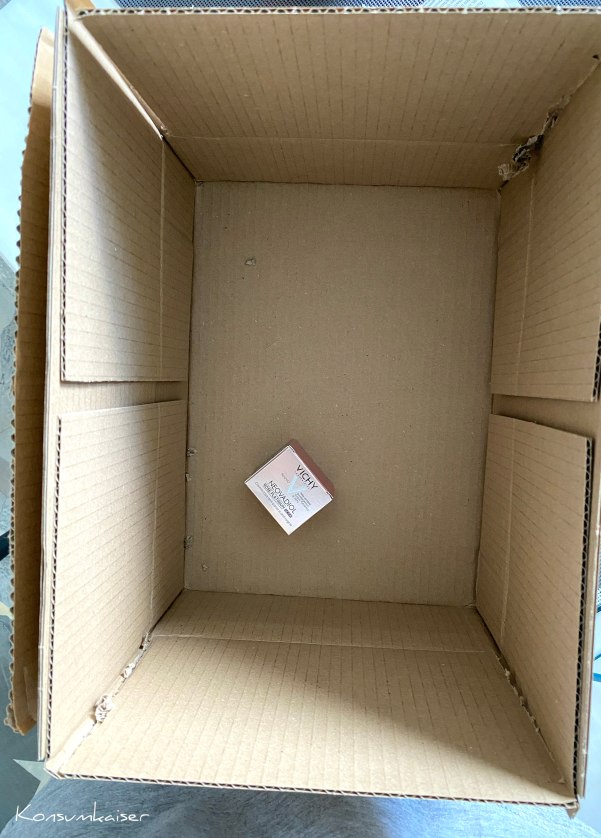 Die ultra-kleine Packung einer Augencreme (15 ml) lag in einem stabilen Paket, in das wohl auch ein Auto-Kindersitz…plus Kind…plus Oma…reingepasst hätte. Leicht übertrieben.