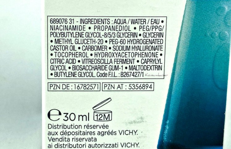 Weiterhin bleibt Vichy bei einer recht reizarmen Formulierung, wobei man beim Niacinamid ein wenig aufpassen sollte. Zumal mittlerweile dermaßen viele Produkte Niacinamid mit an Bord haben, sodass man auf eine zu üppige Summierung achtgeben sollte. Hier bekommt man bereits eine relativ gute Menge von 4%.