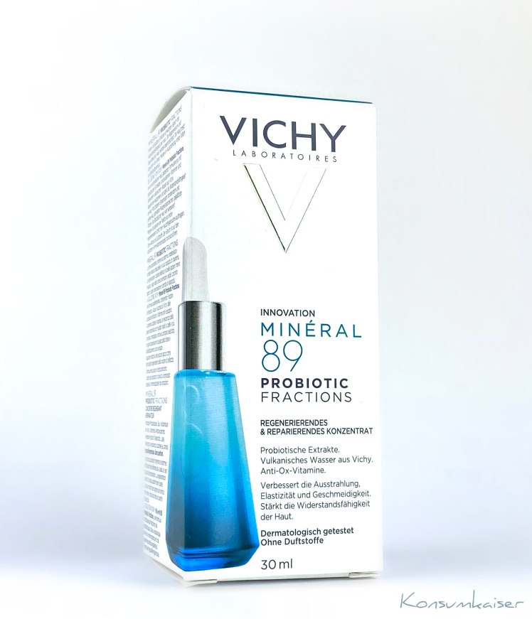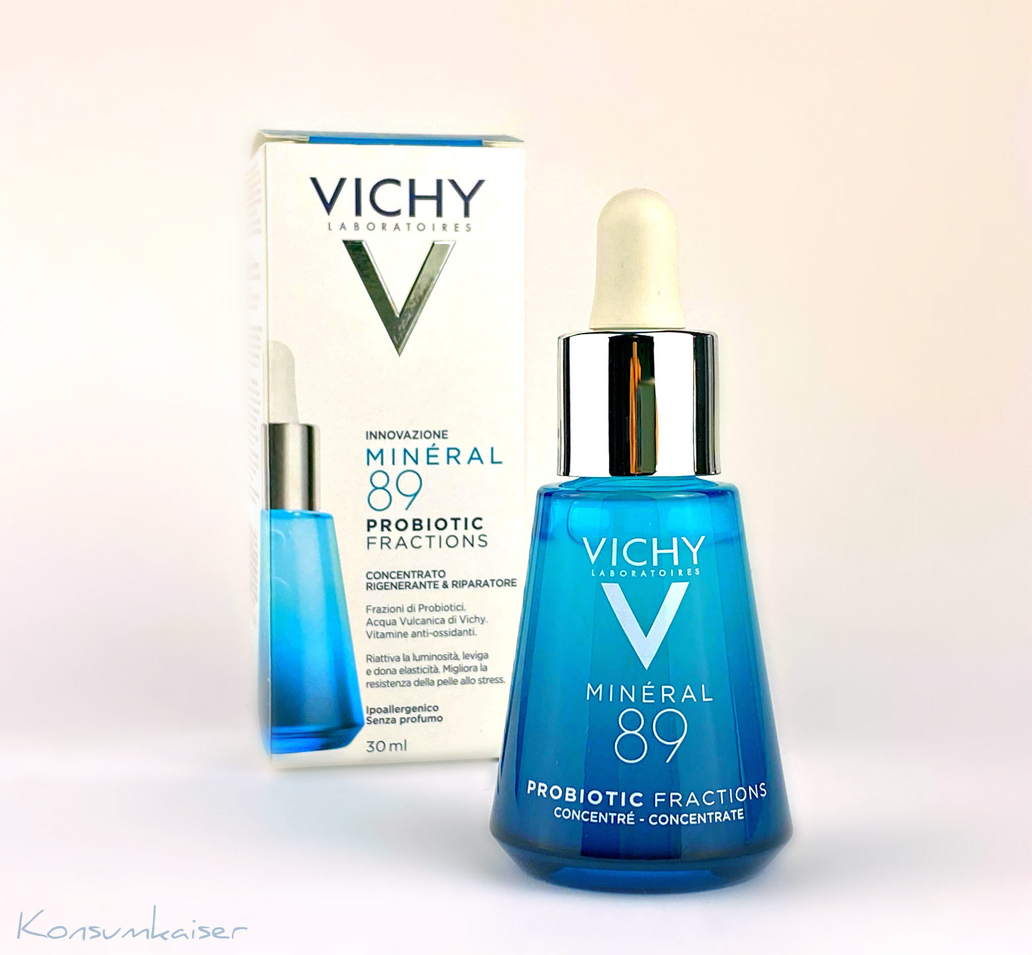 Nun wird es etwas komplexer. Vichy baut auf seinem alten Minéral 89 auf, gibt aber beim neuen „Probiotic Fractions“ so einige Inhaltsstoffe mehr dazu. Man hofft, dass die Formulierung noch stärker die hauteigene Regeneration anregen mag, und zusätzlich soll die Widerstandskraft der Haut verbessert werden. Dazu werden Probiotische Extrakte eingesetzt.