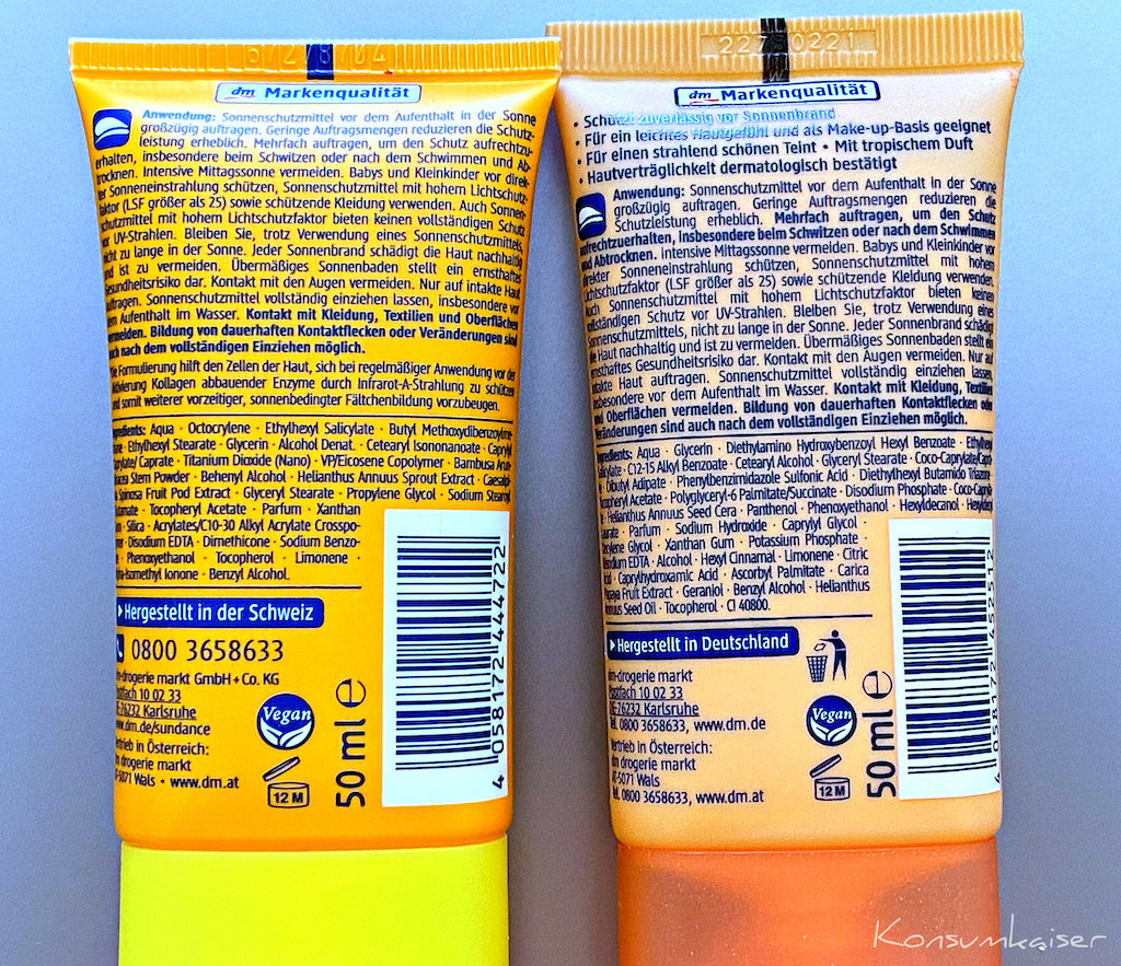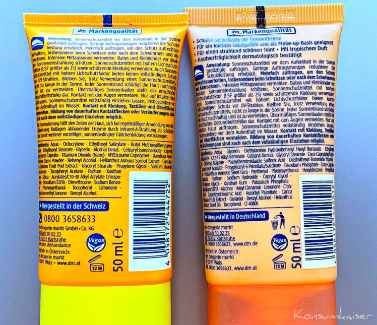 Kommen wir zu den „schattigen“ Produkten. Die kommen vom dm Drogeriemarkt und sollen mit einem mMn moderaten Schutz tagtäglich vor UV-Strahlung schützen. Das „Glow“-Produkt eignet sich mehr für die City, während der „Matt“-Sonnenschutz auch wasserfest ist. Jedoch ist ein LSF30 im Hochsommer und womöglich in südlichen Gefilden ein bisschen wenig.