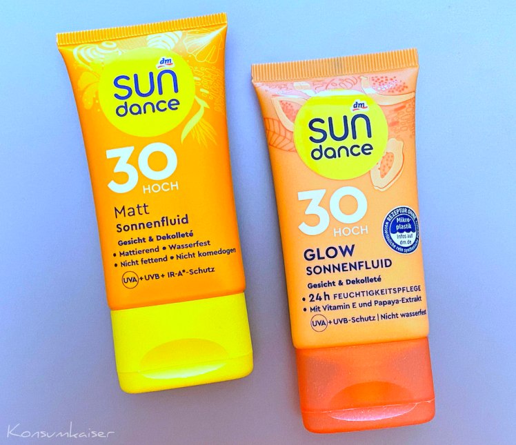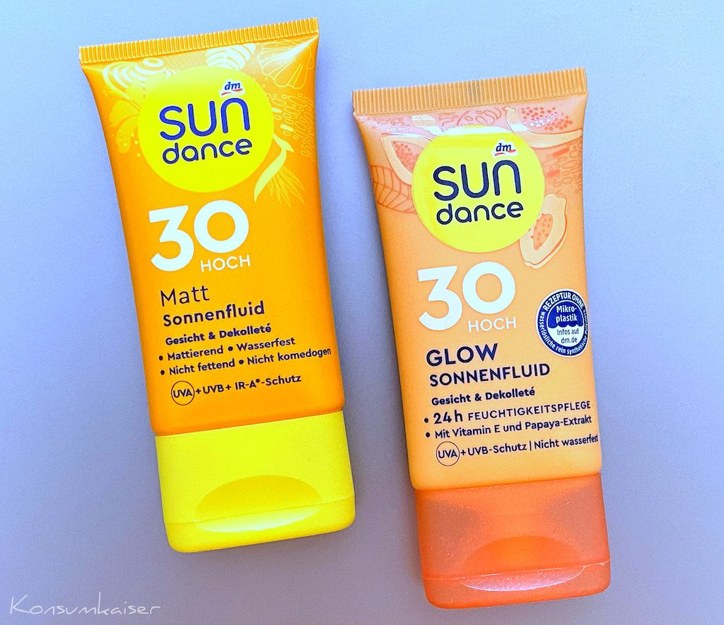 DUN DANCE (dm EIGENMARKE) Matt Sonnenfluid (wasserfest) und Glow Sonnenfluid (nicht wasserfest) SPF 30 (je 50 ml ca. 3-4 Euro / im dm Drogeriemarkt)