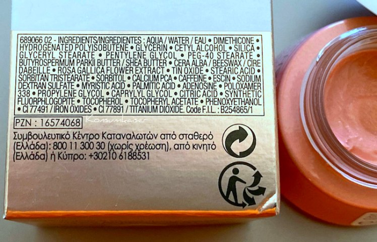 Der leicht aufhellende Effekt wird durch Eisen- und Titandioxid realisiert, was naturgemäß gut und erfreulich natürlich aussehend geschieht. Die Pflege ist auch sehr schön, dazu verzichtet Vichy auch auf Parfüm und ätherische Duftöle (bis auf den Rosenextrakt, da bin ich mir nicht sicher, wie er gewonnen wird), was diese Augencreme doch recht empfehlenswert macht.