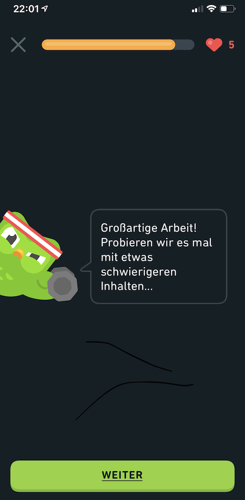Jeden Tag eine kleine Lektion mit meiner Sprachlern-App. Nur wenige Minuten, aber man bleibt am Ball. Aufgefrischt, neu hinzugelernt, es läppert sich. Und weil die Einheiten so kurz sind, gibt es eigentlich auch keine Ausreden. Das schafft man eigentlich immer, und wenn es abends im Bett ist.