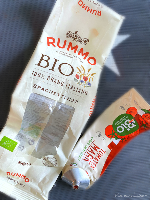 Das Bio-Tomatenmark war sauer wie aus Zitronen gemacht. Dazu völlig unaromatisch und leicht bitter, sodass ich die Tomatensoße zum Schluss noch mit mehreren Teelöffeln Zucker süßen musste, um sie genießbar zu machen. Und nein, ich esse sonst kaum Ketchup und habe meinen Geschmack nicht auf „zu süß“ getrimmt.