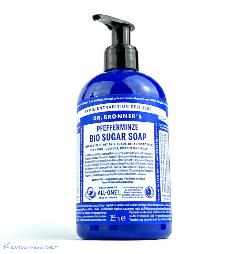 Die kultige Bio Sugar Soap Pfefferminze von Dr. Bronner´s aus den USA empfehle ich nun aber wirklich nur robuster Haut. Bitte nicht im Gesicht verwenden, und auch nicht, wenn man durchs ständige Händewaschen und Desinfizieren ausgetrocknete und rissige Hände hat.